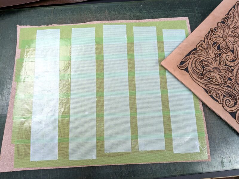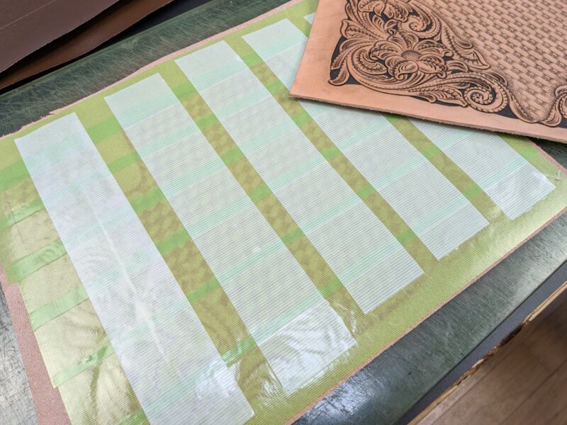 このテープを定規の裏に貼ることで革をカットする際の定規のズレを防ぎ、作品の完成度が上がるという内容。