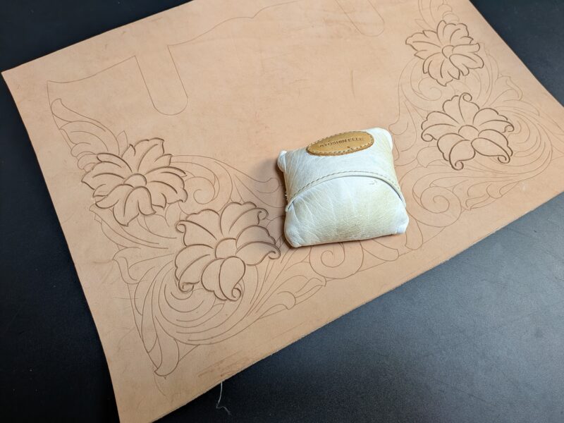 カービングする際、革が滑らないように、下の画像のように革の上にウェイトを置いてカービングしているのですが、